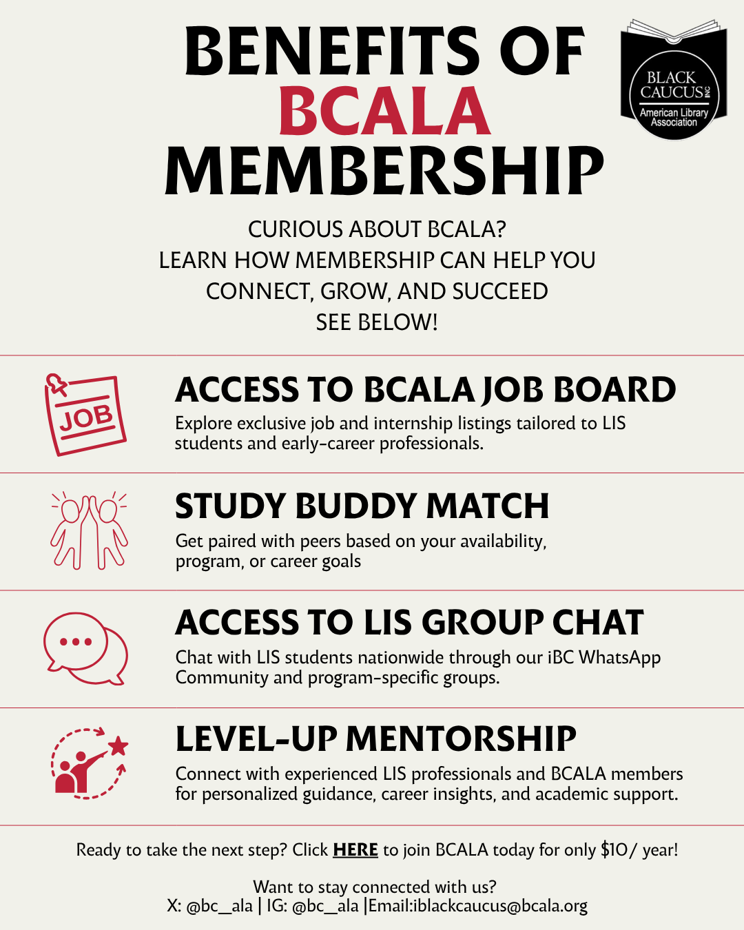 Share the Benefits of iBlackCaucus Membership flyer to highlight the opportunities, resources, and support available to students. It’s a great way to encourage LIS students to get involved and join our community.